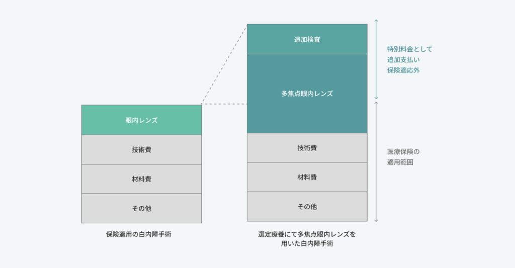 多焦点眼内レンズの手術は、保険適用される「選定療養」と、全額自己負担の「自由診療」の二つの形態があります。